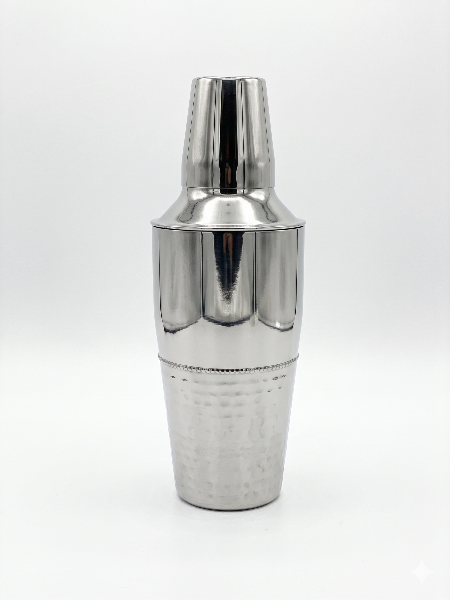 Elevate your beverage service with this Artisanal Hammered Stainless Steel Cocktail Shaker, a perfect blend of vintage charm and modern industrial design. This three-piece set features a sophisticated dual-finish body: a flawless mirror-polished upper section that reflects light beautifully, transitioning into a hand-hammered lower half that provides a textured, non-slip grip for effortless shaking. A delicate beaded ring separates the two finishes, adding a touch of classic craftsmanship to its sleek silhouette. Engineered from premium, food-grade stainless steel, this shaker is naturally rust-resistant and built to maintain its brilliant luster through years of use. With an integrated precision strainer and a secure, leak-proof cap, it ensures a smooth, professional pour for everything from chilled martinis to complex craft cocktails. Whether displayed as a centerpiece on a luxury bar cart or used in a high-paced professional environment, this shaker brings a sense of refined elegance to the art of mixology.