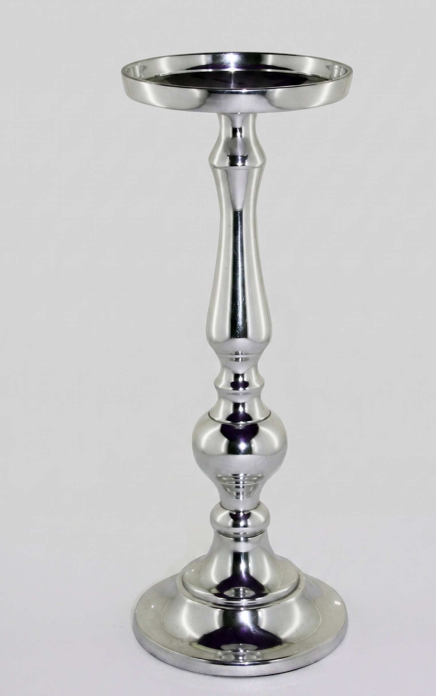 This elegant pillar candle holder is a masterclass in sophisticated design, featuring a brilliant, high-polished silver finish that radiates a luxurious mirror-like glow. Its silhouette is defined by a gracefully contoured stem, showcasing expert craftsmanship through its series of architectural “turned” details and a central orb-like accent. This slender neck transitions seamlessly into a wide, shallow tray at the top, bordered by a subtle raised lip to securely cradle pillar candles or small floral arrangements.