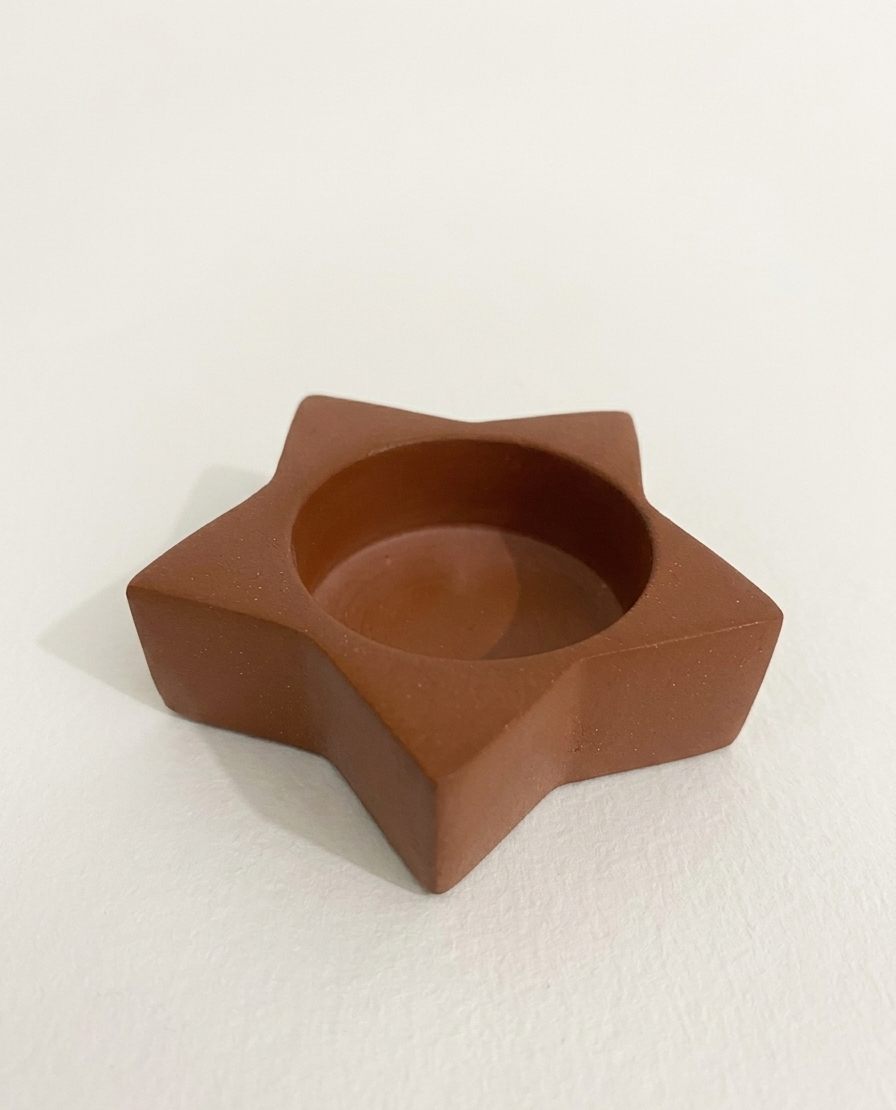 The [Product Name] is a refined reimagining of the classic star motif, transformed into a piece of functional architectural art. Its striking five-point silhouette is defined by crisp, angular lines and deep-set facets that play beautifully with light and shadow. The circular recessed center provides a functional heart to the piece, ideal for cradling a flickering tea light or nesting cherished trinkets. With its rich, matte terracotta finish and substantial, stone-like feel, this vessel bridges the gap between whimsical symbolism and high-end minimalist design, making it a timeless accent for the modern, curated home.