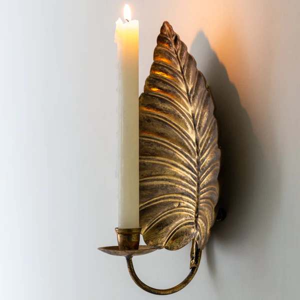 This antique gold coloured leaf-shaped sconce will add a touch of sophistication to any space. Its distressed gold finish pairs beautifully with your favorite candle, and the saucer at the base of the candle holder will help contain any dripping wax. Hang in pairs for a classic look that brightens up your home.