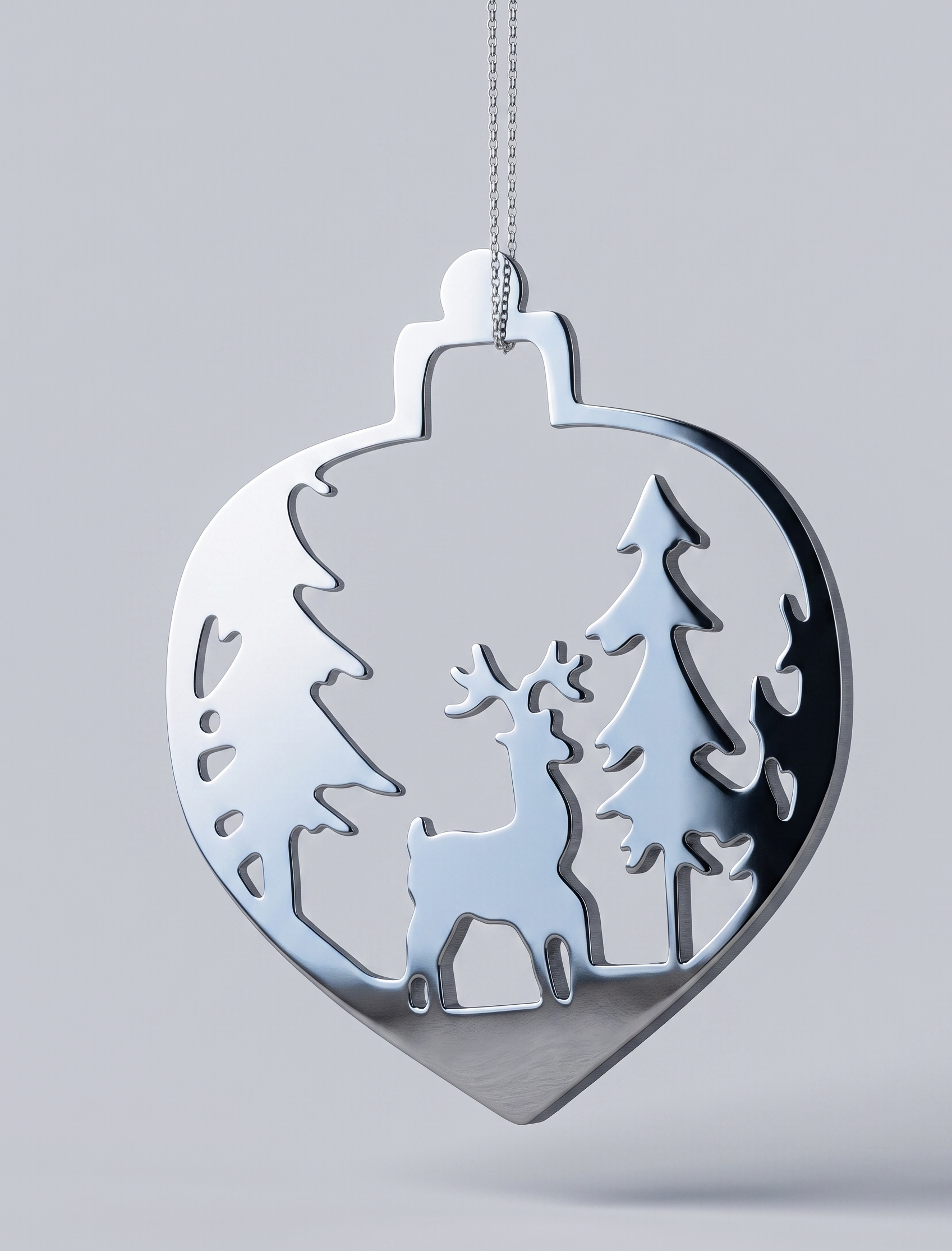 Feature Details Material Premium Polished Metal Color Chrome Silver Design Woodland Reindeer & Pine Forest Cut-out Dimensions Approx. 4.5″ Height x 3.75″ Width Attachment Includes a slender, durable silver hanging cord