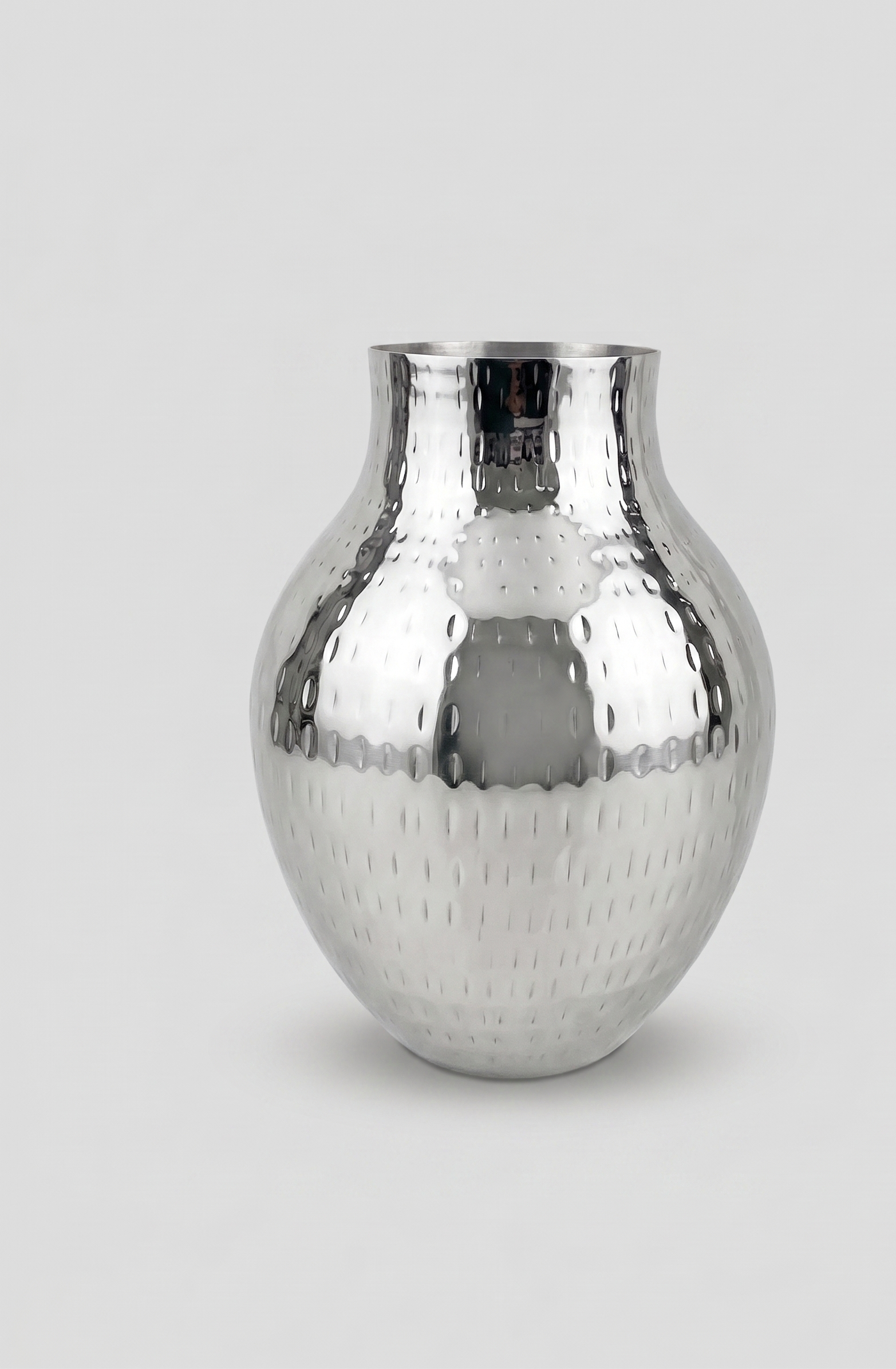 This hand-hammered metal vase blends traditional artisanal techniques with a sleek, modern silhouette. The vessel features a classic bulbous body that tapers into a graceful neck, creating a timeless “urn” shape. Its defining characteristic is the textured dimpled surface, which breaks up reflections and adds a rich, tactile dimension to the high-shine finish.