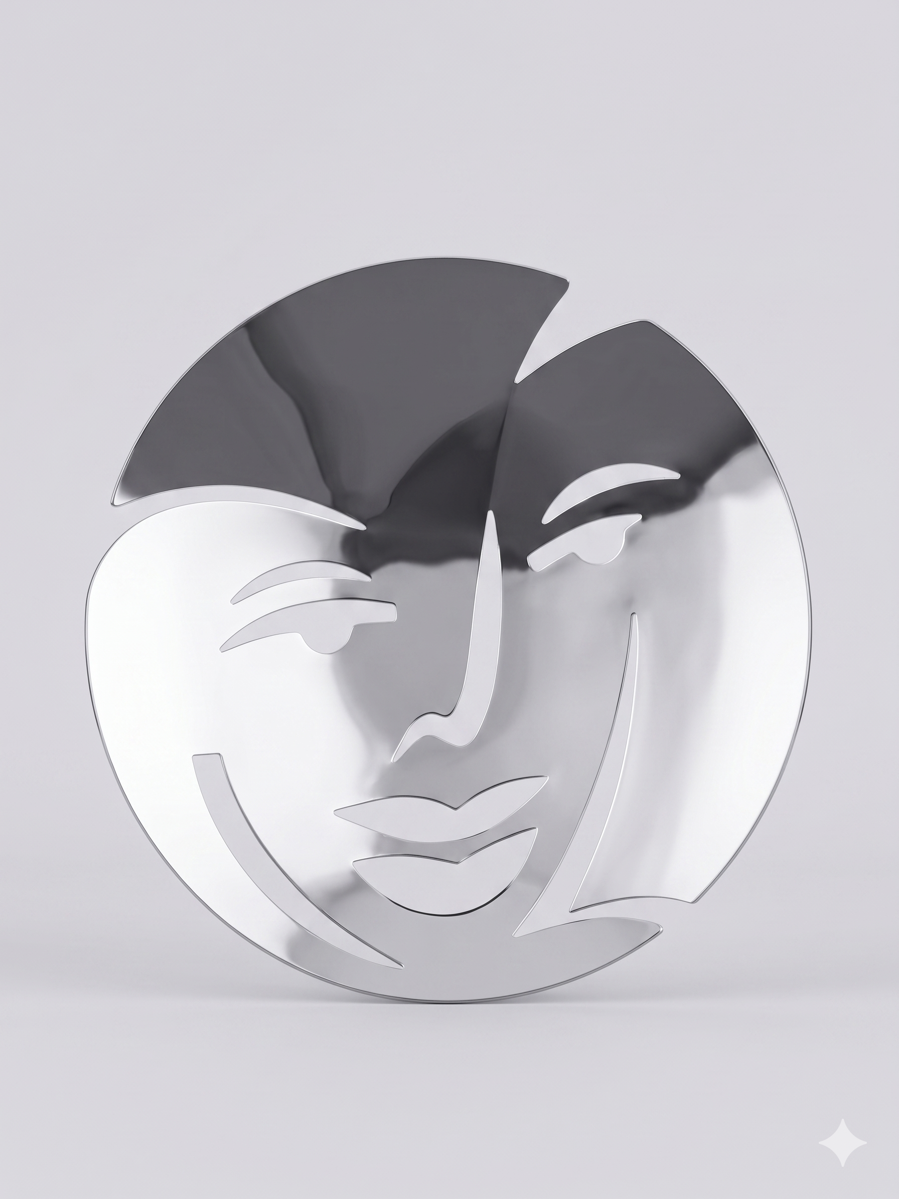 Design: An avant-garde, “one-line” style silhouette of a human face integrated into a circular, concave form. The cut-out details for the eyes and lips create a play of light and shadow.