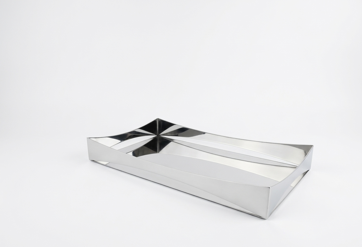 Architectural Aesthetic: The tray uses folded-metal logic to create a three-dimensional, origami-like form.